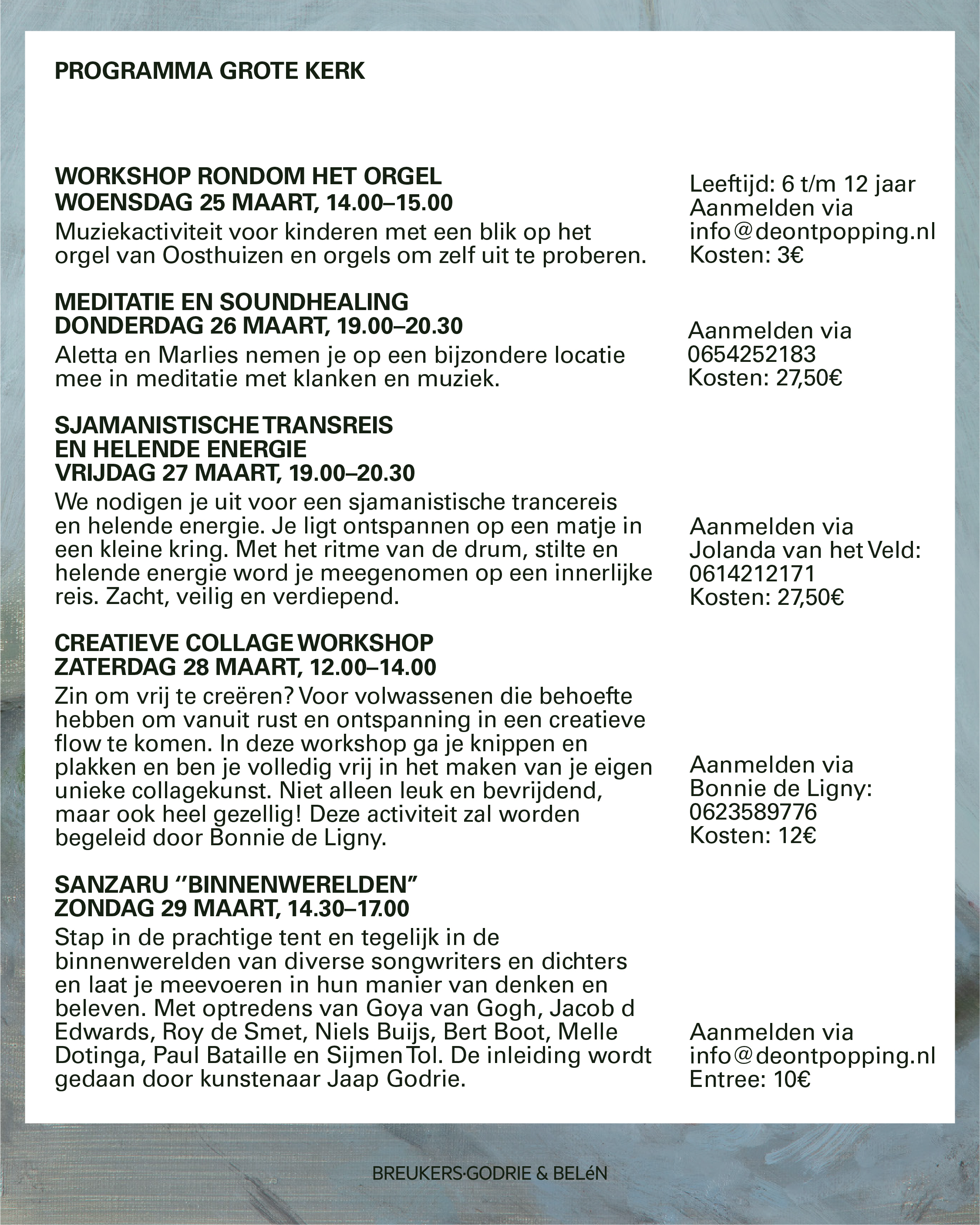 (Vanwege het ontbreken van verwarming zijn er 's winters in de kerk van Oosthuizen geen activiteiten. Maar vlakbij is de kerk van Beets met een interessant programma voor de wintermaanden. Meer info: kerkbeets.nl